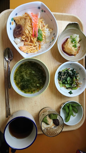 散らし寿司 揚げ出し豆腐 あおさの味噌汁 モロヘイヤのお浸し えだまめ 和風ミニパフェ